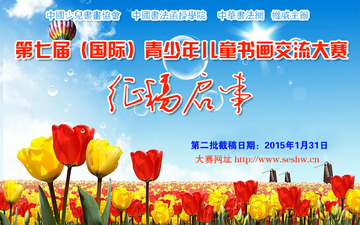 为加强国际青少年儿童书画交流学习,特举办第七届(国际)青少年儿童书画交流大赛。征稿工作已经开始,现诚邀贵单位组织参与,具体活动细节如下: ★ 主办单位:中国少儿书画协会 中国书法函授学院 中华书法网 协办单位:中国少儿书画网 ★ 征稿对象:面向中国(含港、澳、台地区)及世界各国的青少年儿童。分为幼儿组(6岁以下)、少儿组(7-12岁)、少年组(13-17岁)、青年组(18-30岁)。 ★ 征稿要求: 1.美术:包括国画、油画、水彩(粉)画、装饰画、儿童画、版画、素描、剪纸及手工制作等。 2.书法:包括毛笔、硬笔、篆刻。行、草、篆请附译文。 3.作品规格:国画、书法作品不要超过四尺宣纸,美术作品不得超过对开纸。 4.请在参赛作品背面右下角注明作品标题、作者姓名、性别、年龄、辅导老师、地址、邮编及电话。 5.集体参赛作品请统一列表、邮寄。并请辅导老师进行初评,供组委会参考。 6.征稿题材要求健康向上,具体内容不限。参赛作品寄原作或照片,一律不退稿。 7.中国大陆个人参赛报名费人民币45元/幅,集体组织参赛报名费人民币30元/幅(海外及港澳台地区10美元),中国少儿书画协会会员参赛费20元(需附会员证复印件)。请通过邮局汇款,如需要银行转账汇款请联系我们。 8.可以通过网络投稿,作品照片文件名称以“编号+姓名”命名,并根据“编号”填写《集体参赛登记表》,请将稿件发送到大赛电子邮箱。 ★ 奖项设置及评奖标准: 一. 参赛作品奖:1. 本次大赛以鼓励为主,设特等奖1%、金奖5%、银奖10%、铜奖30%及优秀奖若干名。2. 铜奖以上颁发证书和奖牌,优秀奖颁发证书,证书寄往学校或幼儿园予以表彰。获奖作品编入《大赛作品集》,优秀作品将推荐在相关报刊及书画网站上刊登发表,同时授予“国际小书画家代表”称号。获奖者可申请加入中国少儿书画协会。 二.教师奖:组织10人(幅)以上的老师颁发特等、一、二、三等及优秀辅导奖证书,获奖老师均发精美证书,予以表彰,可作为今后评职称考核晋级的重要依据。并聘请为中国少儿书画协会理事以上职务。 三.集体奖:对组织200、100、50、30人以上参赛的单位分别授予团体特等、一、二、三等奖,颁发不同档次的镀金奖杯。100人以上同时授予“全国优秀书画艺术教学机构”称号铜牌。200人以上同时授予“全国百强书画艺术名校”称号高级铜牌。组织30人(幅)以上参赛单位赠送往届已出版《作品集》一册(先投先得,数量有限送完即止)。 ★ 截稿日期:2015年1月31日(以当地邮戳为准) ★ 寄稿、汇款地址:中国福建省福州市华林邮政03A-114信箱第一收稿组 收件(款)人:大赛组委会(收) 咨询热线:400-670-6218(上午8:30-12:00 下午2:30-6:00) 电话/传真:0591-87400005 邮编:350003 E-mail:610917385@qq.com 大赛QQ:210971799、969157783、610917385 大赛网址 http://ds.seshw.cn http://www.seshw.cn http://www.zhsfw.com